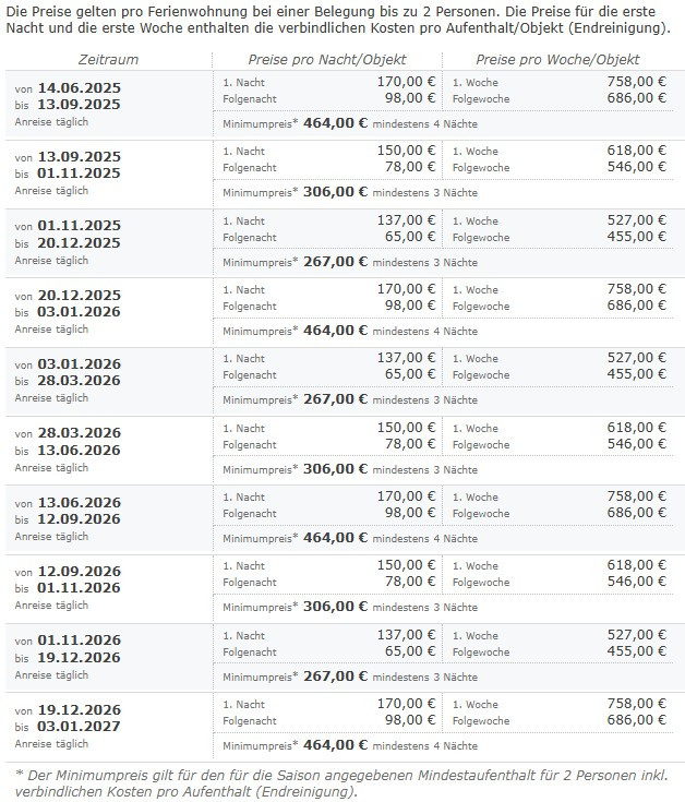 Die Preise gelten pro Ferienwohnung bei einer Belegung bis zu 2 Personen. Der Preis für die erste Nacht enthält die verbindlichen Kosten pro Aufenthalt/Objekt (Endreinigung, Buchungsgebühren).